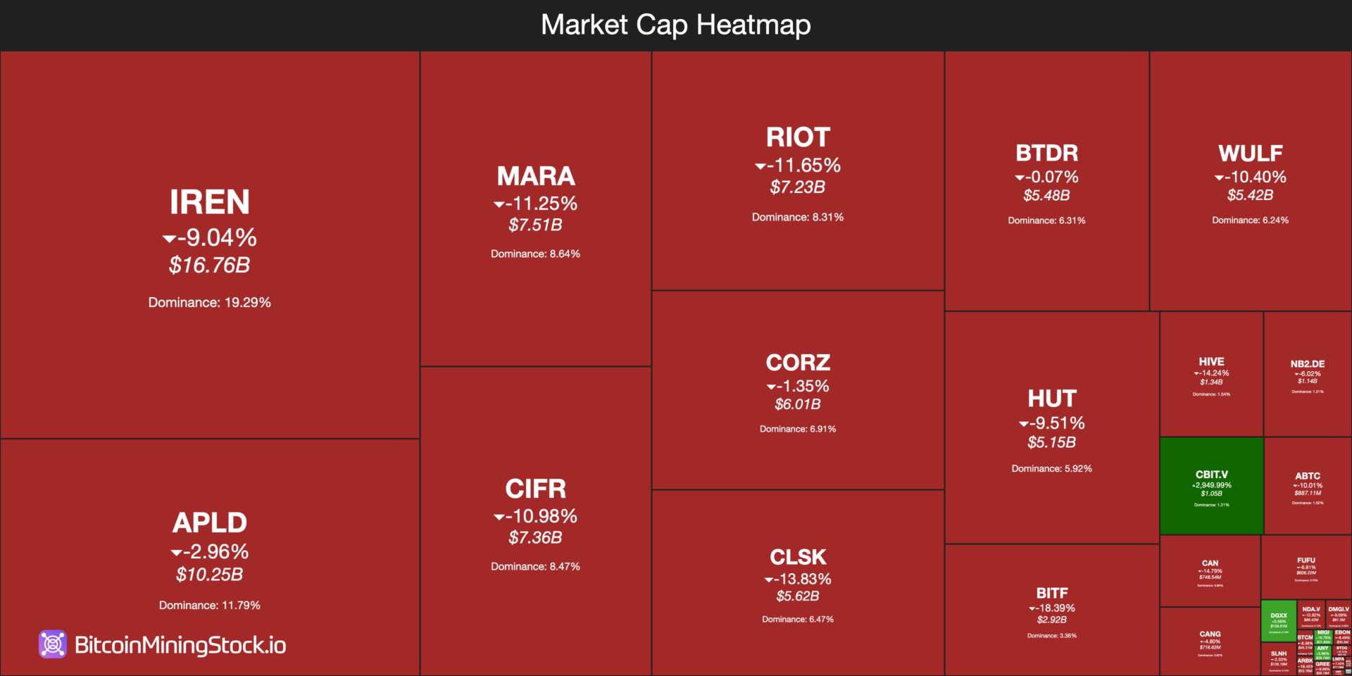IREN Limited leads the Bitcoin mining sector with a market cap of $16.76 billion, although its shares declined around 9% to trade near $61.83. Applied Digital Corporation (APLD) holds a market cap of about $10.25 billion with shares easing approximately 3% to trade near $36.64. MARA Holdings (MARA), with a market cap near $7.51 billion, saw shares plunge around 11.25% to about $20.27 amid acquisition activity.