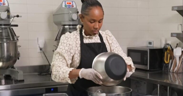 Lara Adekoya says her Los Angeles bakery is now paying $50 to $100 more per bag for premium ingredients imported from countries around the world due to President Trump’s tariffs. Elise Preston reports.