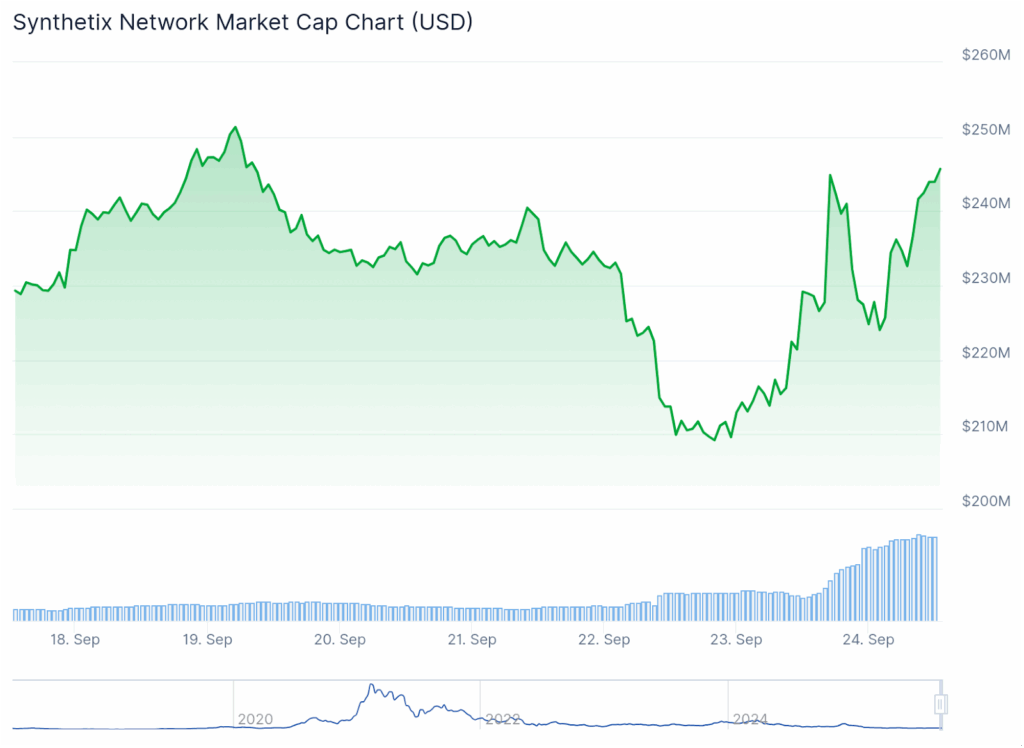 SNX market capitalization fell to roughly $205 million on September 22, 2025, before recovering to above $240 million in a classic V-shaped rebound. This swift recovery in market cap, coupled with steady volume increases throughout September, signals renewed investor confidence rather than mere low-liquidity noise. Such market-cap movements are crucial as they reflect the collective sentiment and trust investors have in the asset.