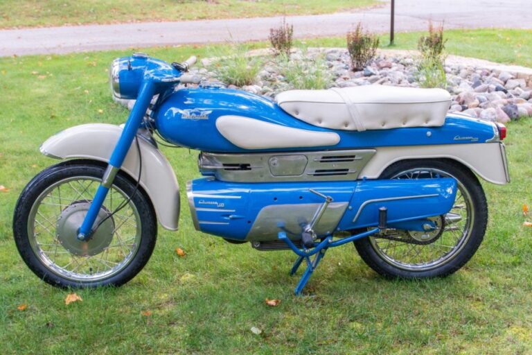 This 1958 Aermacchi Chimera 175 was reportedly refurbished in Italy circa 2020 under prior ownership and was acquired by the seller in 2024 and subsequently imported into the US. The bike is equipped with a 172cc four-stroke single paired with a four-speed transmission and the streamlined bodywork is finished in blue and white. Details include a white two-up seat, a Dell’Orto carburetor, a chrome exhaust system, a left-side kick starter, a heel/toe shifter, a headlight, a taillight, a steering damper, aluminum alloy side panels, and a center stand. This Chimera 175 is now offered with a clean Michigan title in the seller’s name.
