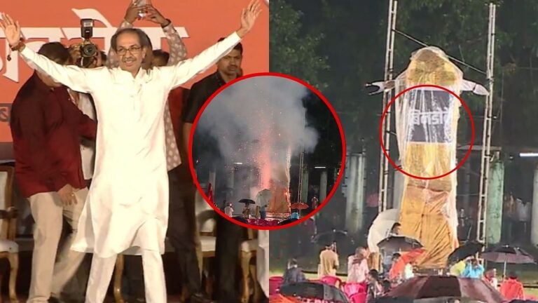 Shiv Sena UBT Dussehra Rally Ignites Headless Ravan Idol With ‘Bindoke’ Message Criticising Mahayuti Govt | VIDEO